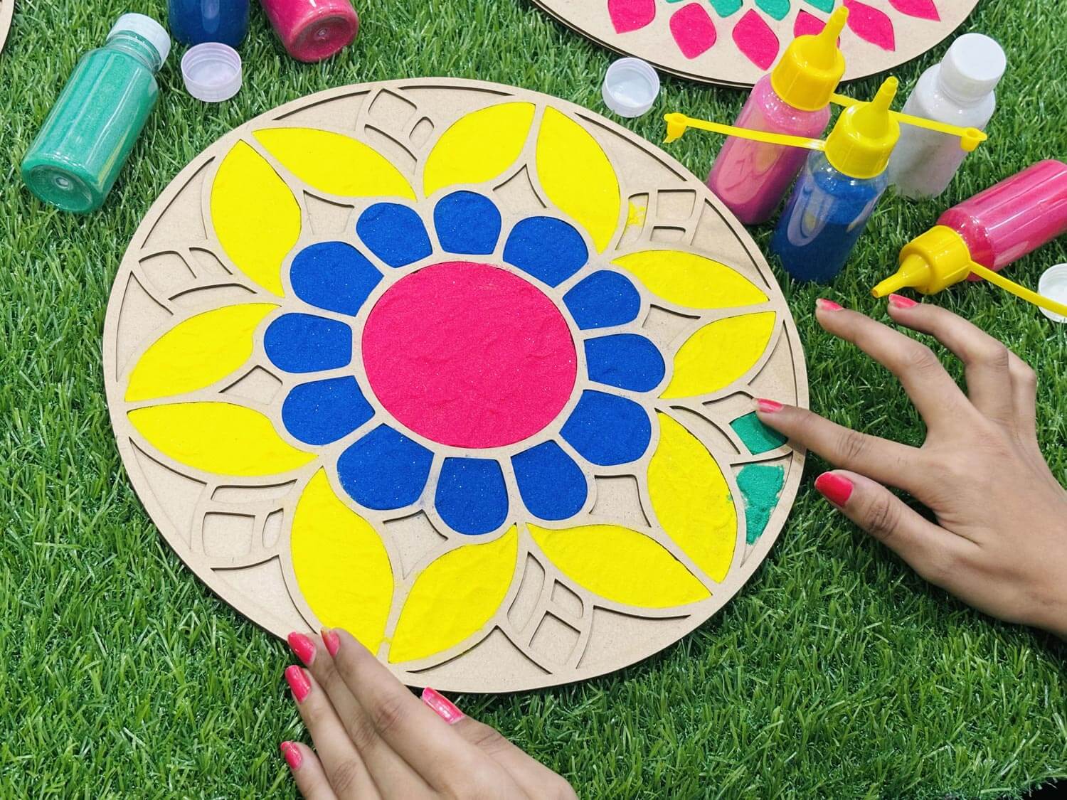 Flower Design Reusable Rangoli Stencil with 6 rangoli colours