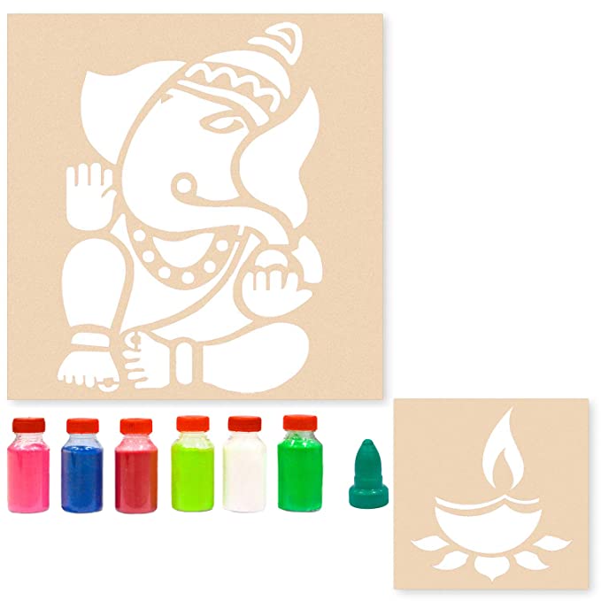 Ganesha Shubh Deepawali Diya Rangoli (Set of 3 Stencil, 6 Colors Bottles, 1 Nozzle)