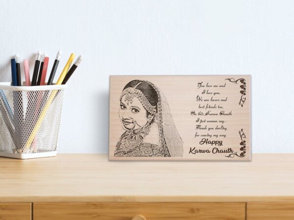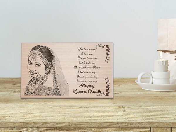 Karwachauth is a special day for every married women in India and husband or friends look for something unique to present on this special day. Incredible Gifts created some unique gifts or ladies gift items that can be presented to wife, sister in laws, mother in law or her. This product is made of natural beech wood and the engraving is done in very fine way. You can touch and feel the depth of the photo and text message on wood. The engraving is for life and it will never fade. You can clean it using wet cloth. It can be used as table top and largest size 12×9 can also be used as wall hanging frame. Present it as a gift for wife special. Karwachauth gift for wife, karwachauth gift for mother in law, karwachauth gift for sister in law, karwachauth gift set or pack or ladies gifts.
