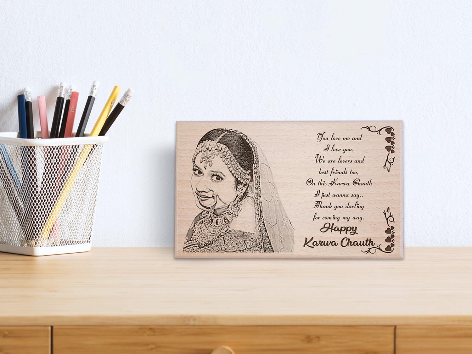 Personalized Karwachauth Engraved Wood Photo Frame Gift for Wife