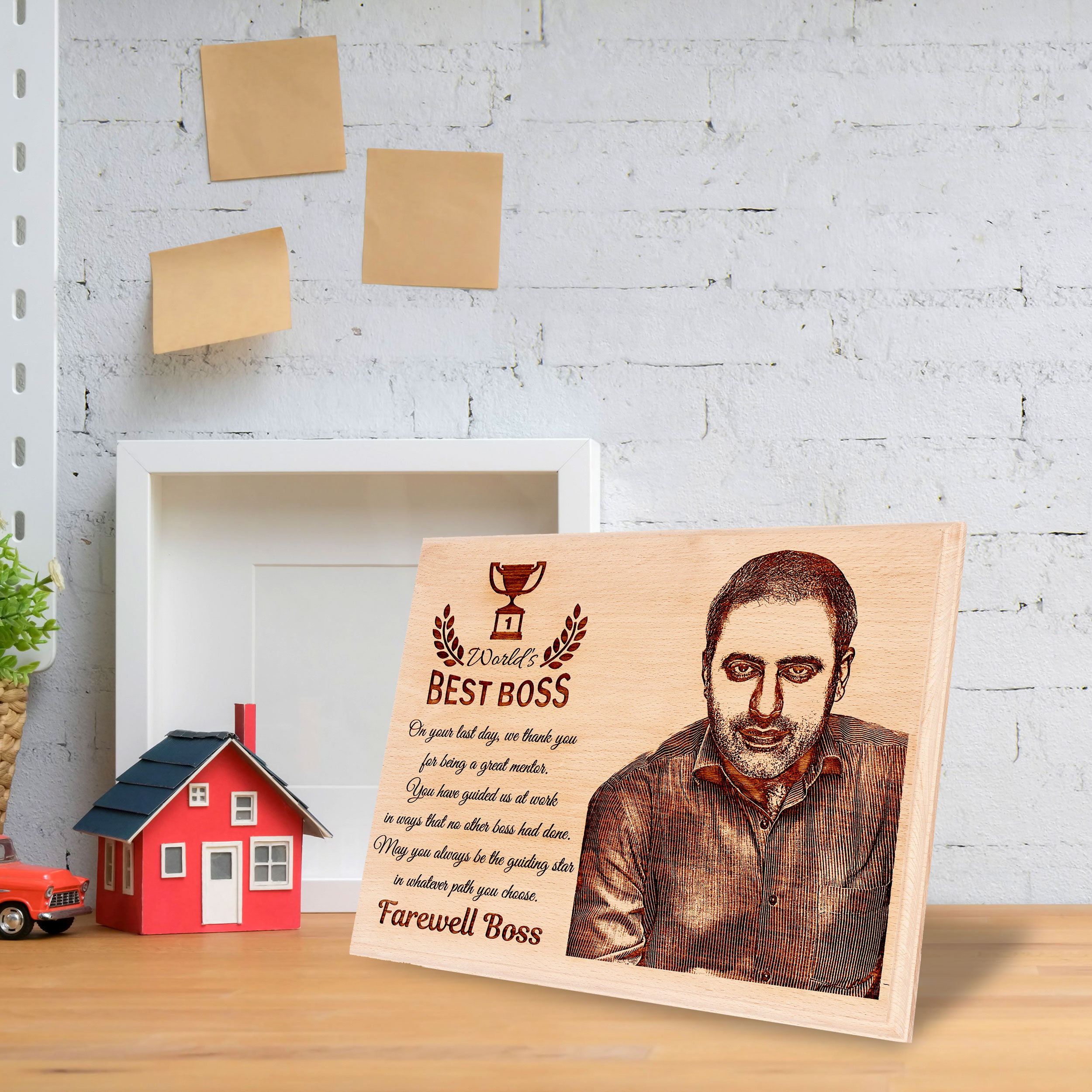 Customized wood photo frame for farewell workplace gift made with wood. This is a great photo frame gift option for farewell employees and coworker at work place that thank them for their service. Made of beech wood that user can upload photo and text, that will be engraved on wood. Celebrate farewell with customized gift made with wooden and proudly make in India, unique gift, different sizes, different designs, customized gift.