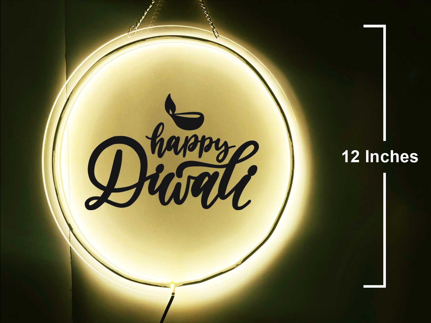 One of the best happy diwali decoration items for gifting or personal use, our Happy Diwali LED Ring Light is a testament to the beauty of the festival. Brighten up your surroundings with this stunning Happy Diwali light decor and immerse yourself in the warmth of the occasion. Let the radiance of this Happy Diwali Hanging neon room decor illuminate your festivities and spread the joy of Diwali in style. Embrace the festive spirit and decorate with flair using our Happy Diwali wall hanging!