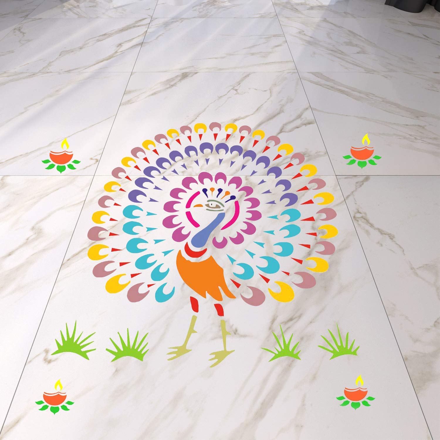 Latest Peacock Diya Rangoli Stencils for Floor(Set of 2 Stencil, 6 Colors Bottles, 1 Nozzle)
