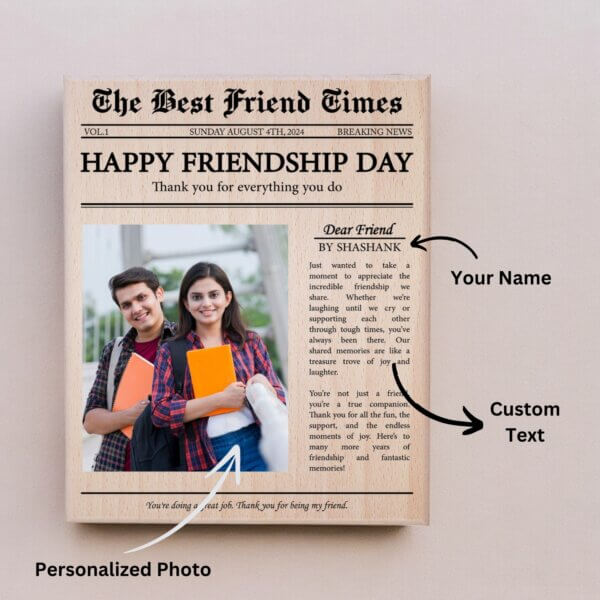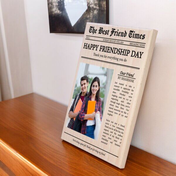 Celebrate the special bond of friendship with our Personalized Newspaper Frame for Friends, a unique and thoughtful gift for Friendship Day. This creative photo frame mimics a newspaper front page, featuring a memorable picture of you and your friend along with a personalized article. It’s the perfect way to showcase your best moments and make your friend feel like a star.