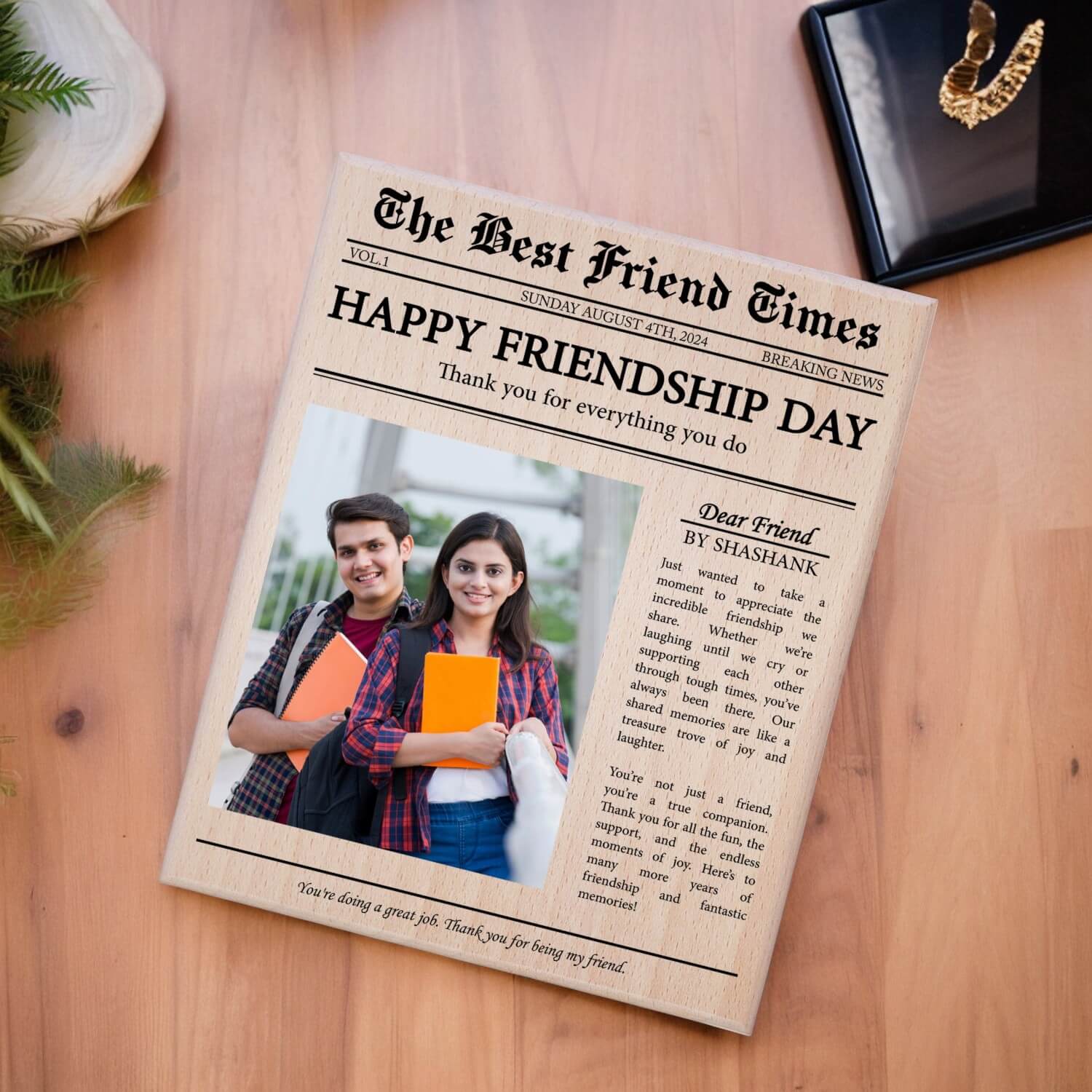 Celebrate the special bond of friendship with our Personalized Newspaper Frame for Friends, a unique and thoughtful gift for Friendship Day. This creative photo frame mimics a newspaper front page, featuring a memorable picture of you and your friend along with a personalized article. It’s the perfect way to showcase your best moments and make your friend feel like a star.