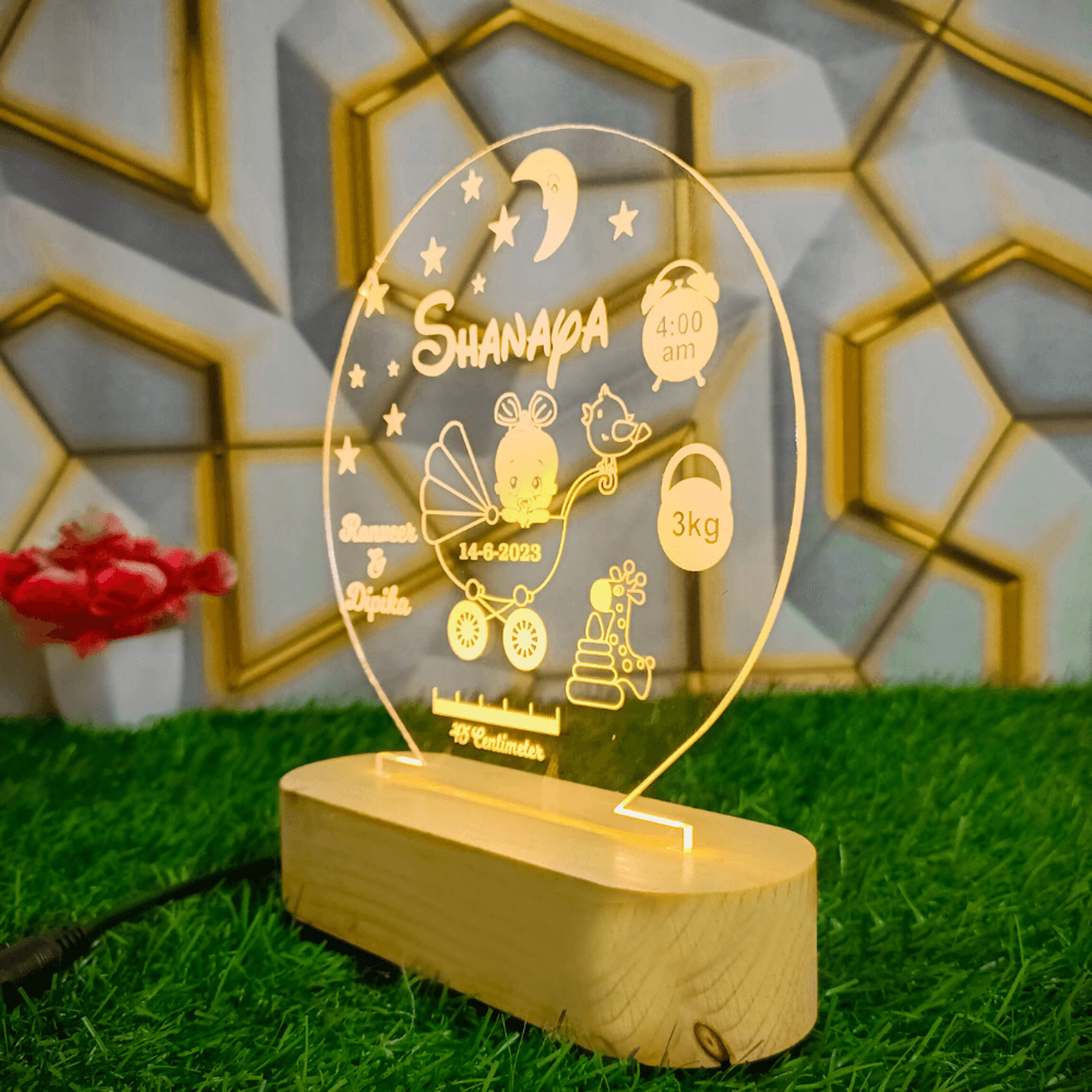Customize the frame with your baby’s name, date of birth, and the names of doting parents for a truly heartwarming touch. The elegant design and soft illumination create a heartwarming environment, making it an ideal gift for baby showers, birthdays, or any special occasion. Our LED Lamp for Baby is not only a beautiful keepsake but also a symbol of love and care. It’s a wonderful way to celebrate the arrival of a new family member and can be proudly displayed in your home or gifted to loved ones.