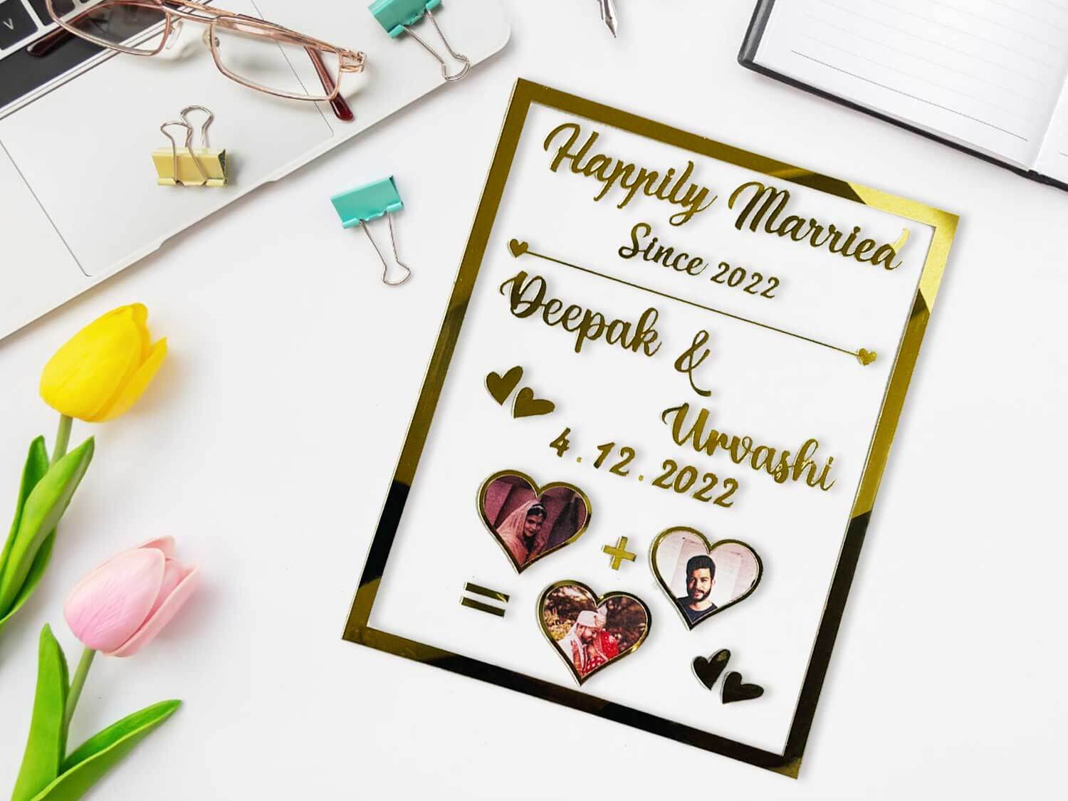This frame is more than just a first wedding anniversary gift it’s a symbol of well-wishes and a reminder of the love that surrounds them. Whether you’re searching for wedding gifts for couples, cool wedding gifts or wedding gifts for bride and groom our Personalized Happily Married Frame is the embodiment of your sentiments. It’s a personalized wedding gift for couple that stands out from the rest, ensuring your present becomes a cherished part of their love story. In summary, our Personalized Happily Married Frame is not just a product; it’s an experience in wedding day gifts.