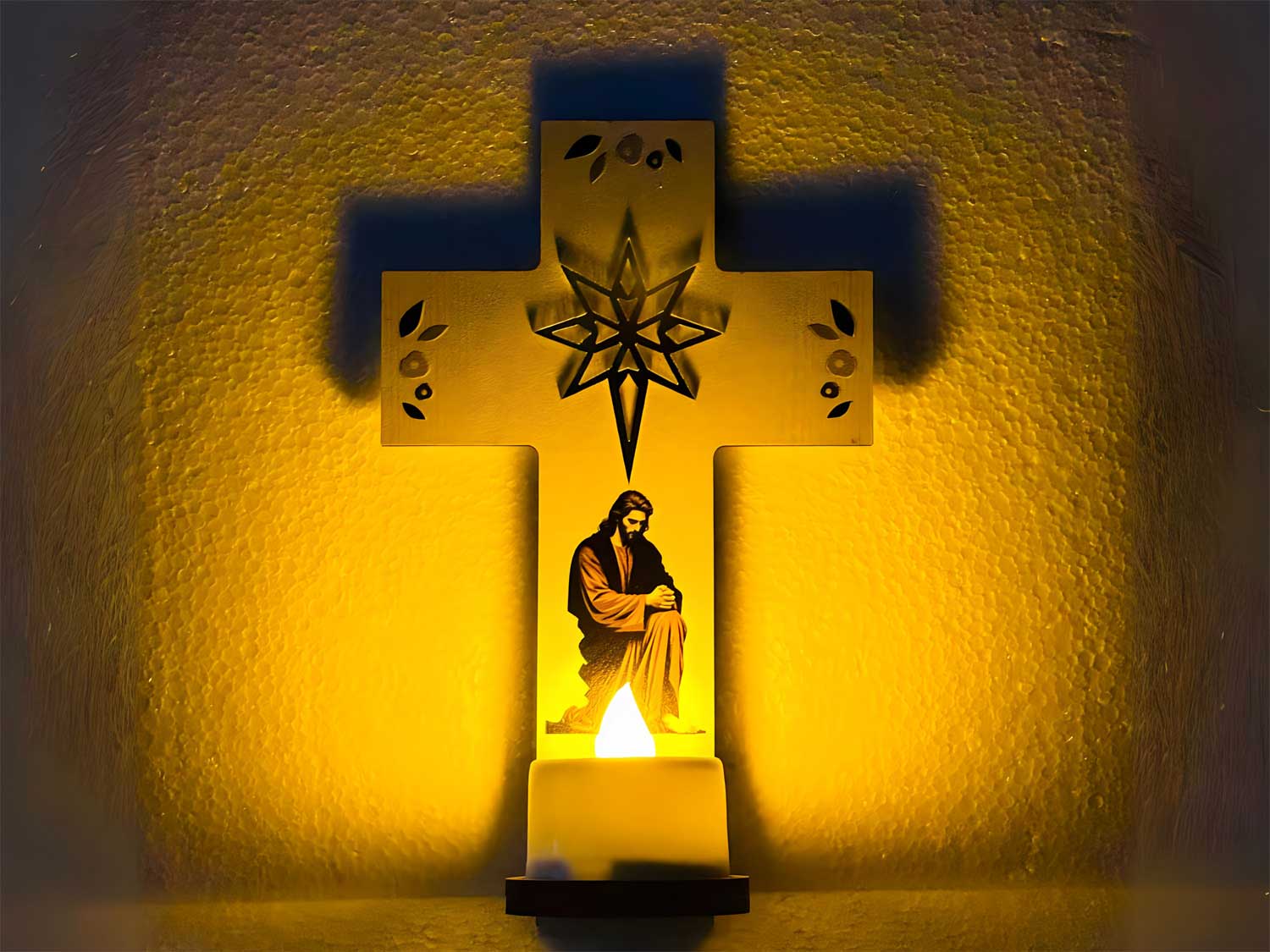Printed Wooden Jesus Cross With LED Tea Light For Festive Decor