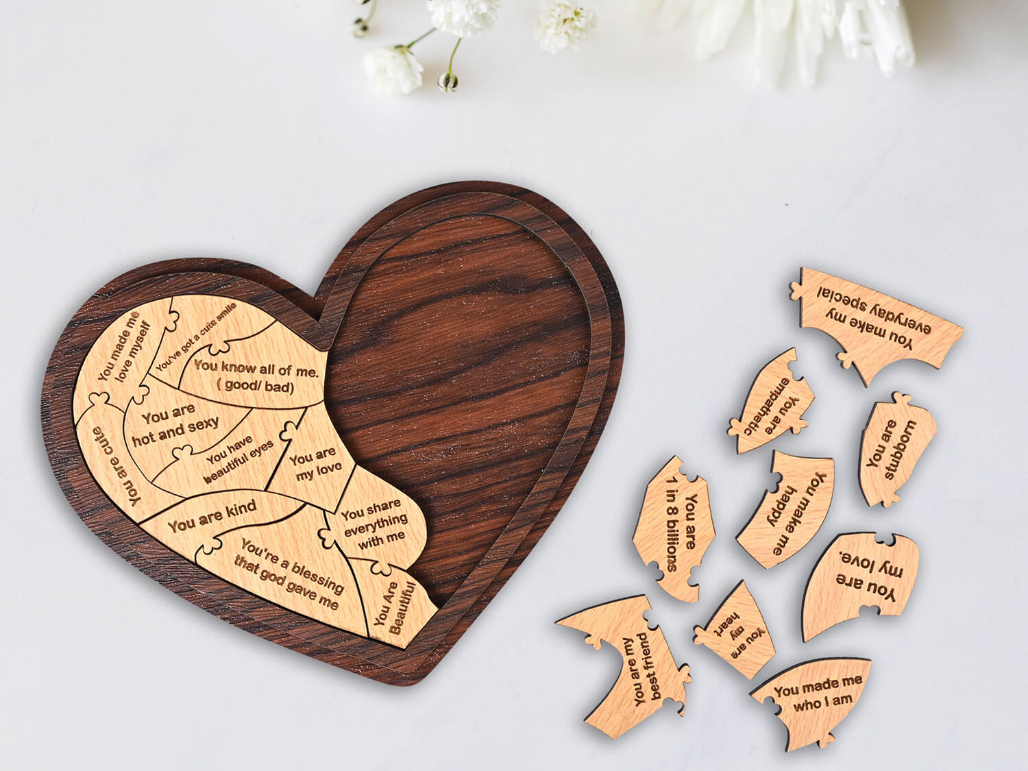 Make every moment memorable with our Personalized Engraved Wooden Photo Frame with 20 Reasons Why I love You Puzzle Box. Crafted with care, this unique gift combo is designed to celebrate the love shared between couples on special occasions like anniversaries, birthdays, or Valentine’s Day.