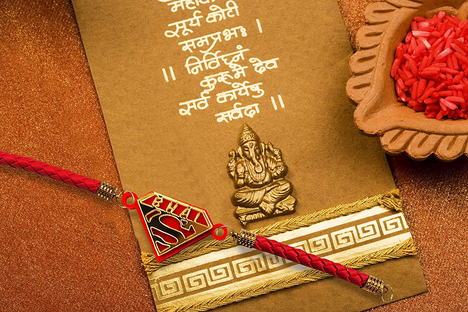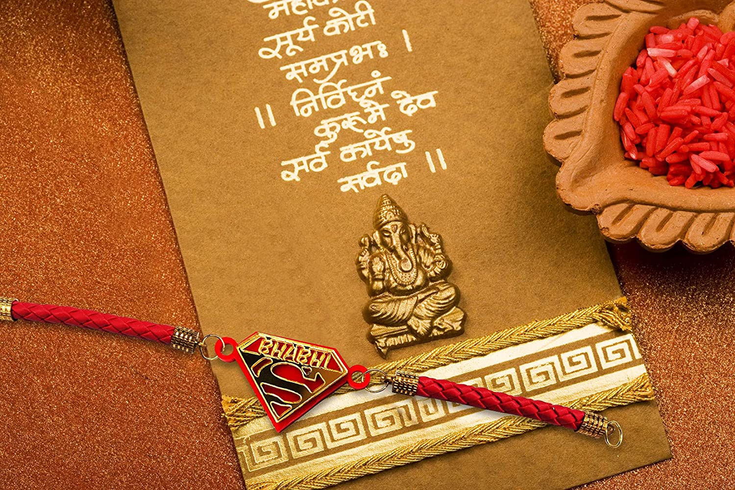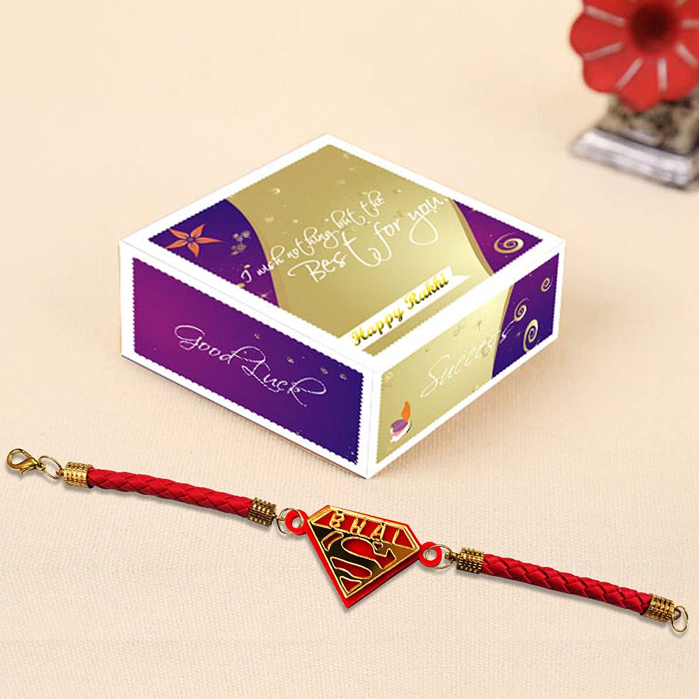 Super Man Designer Bracelet Incredible Rakhi for Brother with Roli Chawal (Red-Gold Acrylic)