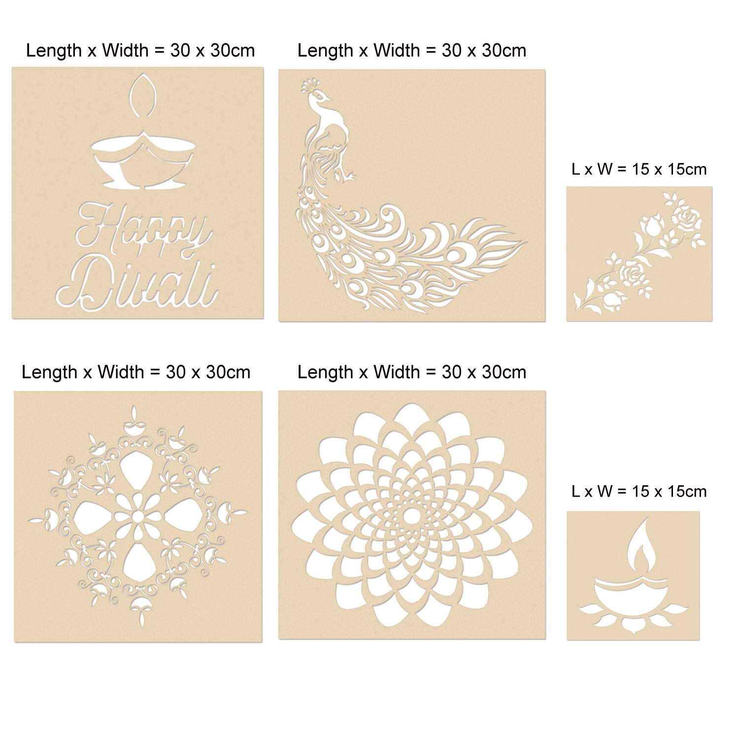 - Size: Set of 6 Rangoli Stencils with 4 Stencils of 30cmx30cm and 2 Stencil is of 15cmx15cm with colours