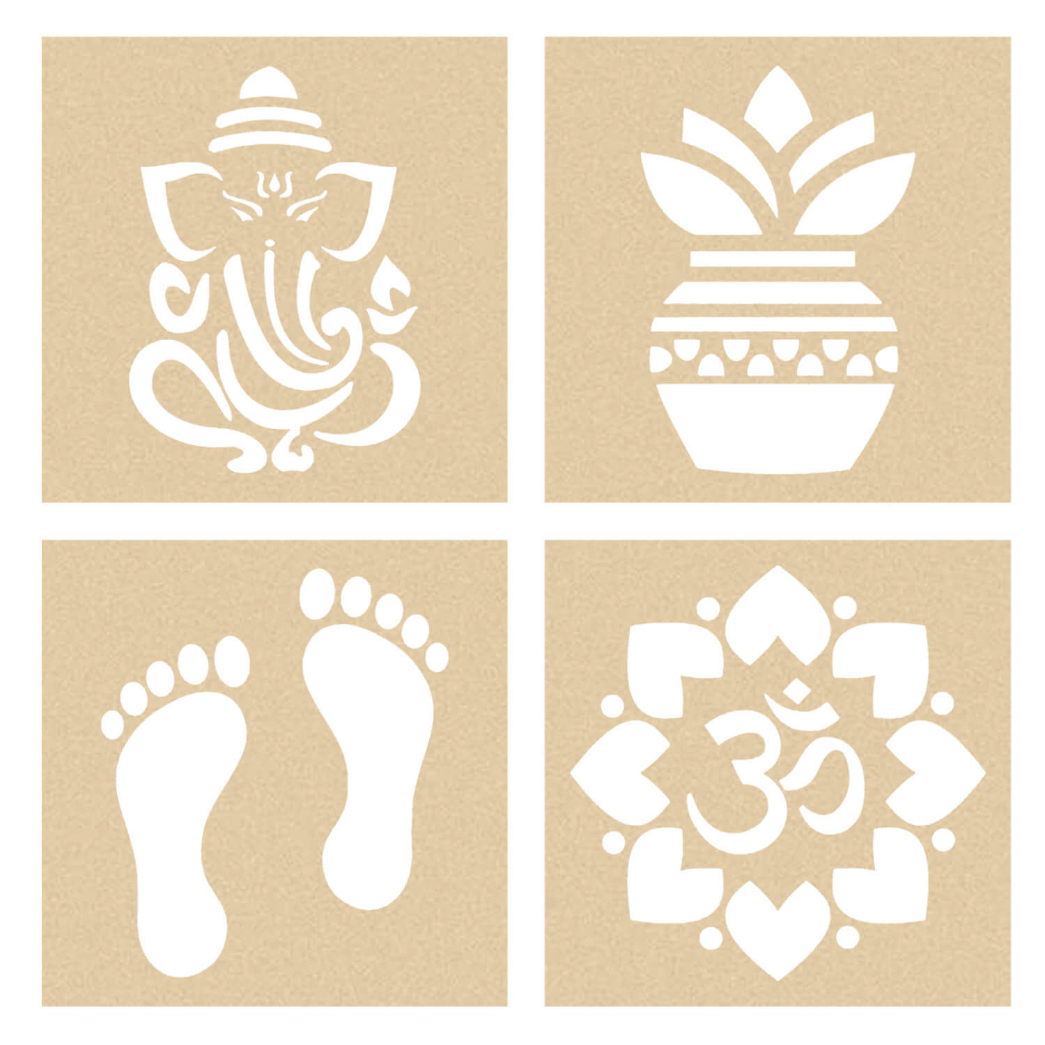 The set includes four unique stencil designs (Laxmi Charan, Kalash, Ganesha & Om) that can be used with the included rangoli colors to make vibrant, intricate patterns. These wooden stencils for rangoli are lightweight, eco-friendly, and reusable, making them an excellent choice for environmentally-conscious buyers. Whether you’re new to creating rangoli or a seasoned artist, this set provides a perfect blend of tradition and modernity.